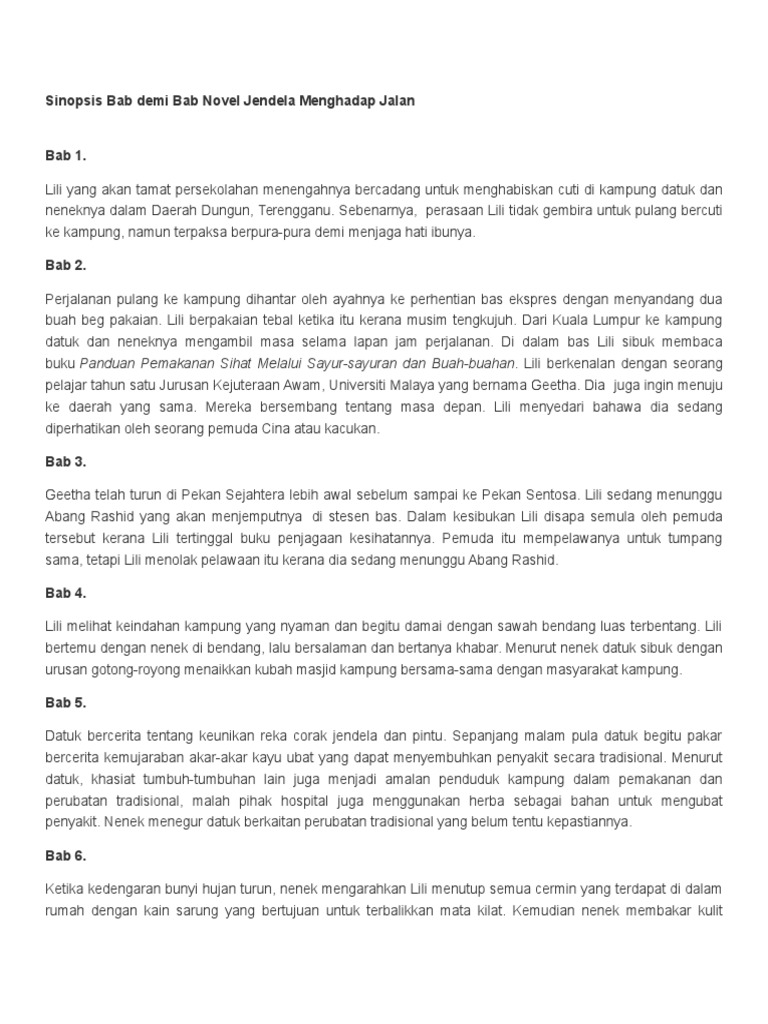 Sinopsis Tema Persoalan Nilai Pengajaran Watak Perwatakan Plot Latar Masa Latar Tempat Latar Masyarakat Teknik Plot Gaya Bahasa Soalan Peperiksaan Skema Jawapan Contoh Soalan Jawapan. NOVEL JENDELA MENGHADAP JALAN Sinopsis Bab 31 Bab 36. Mereka datang hanya ingin memberitahu datuk bahawa penyakitnya telah sembuh dengan menggunakan herba yang diberikan oleh datuk.